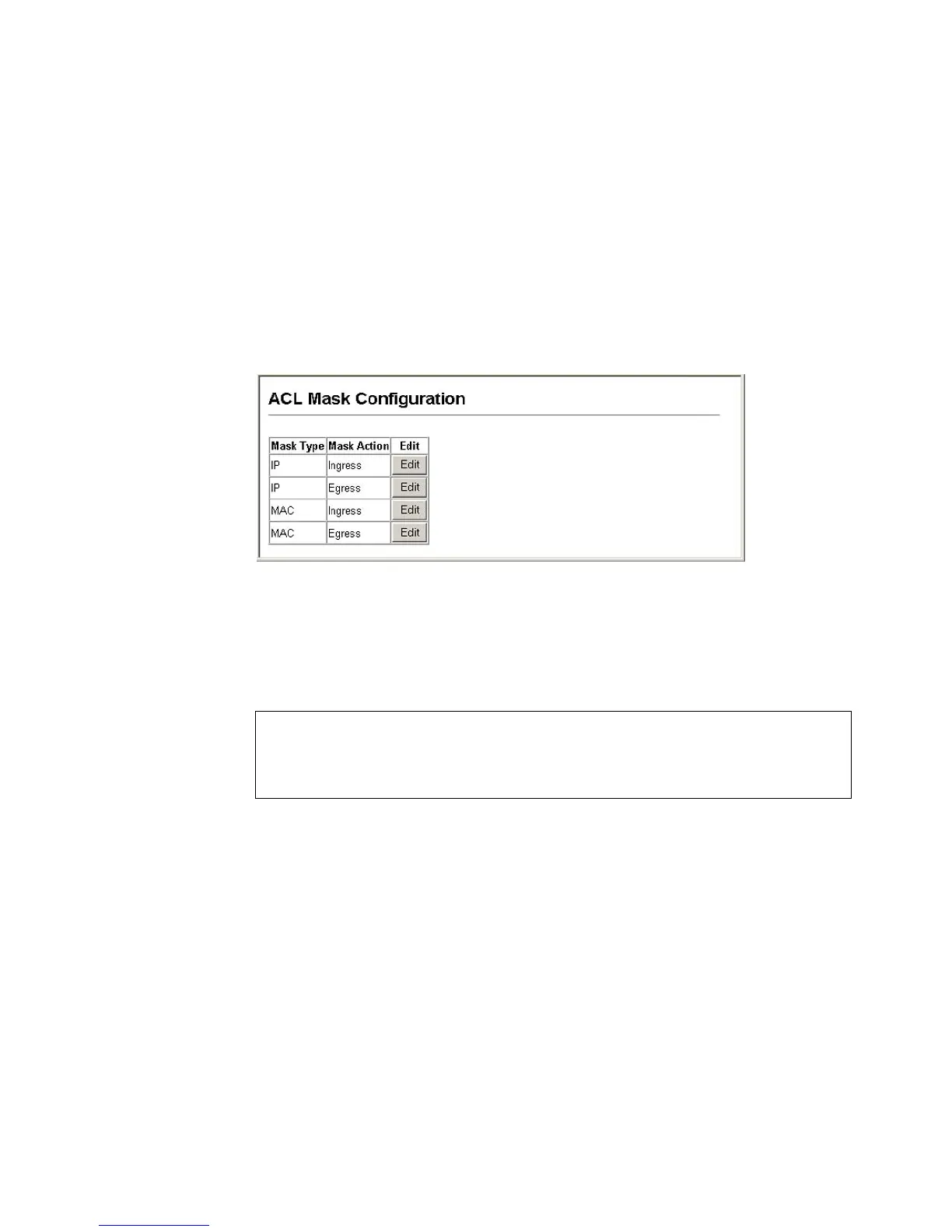 Use the ACL Mask Configuration page to edit the mask for the Ingress IP ACL,
