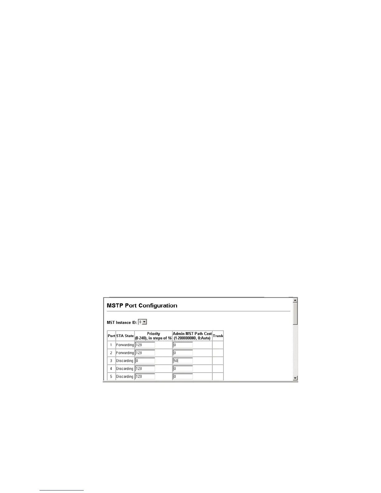 • Admin MST Path Cost – This parameter is used by the MSTP to