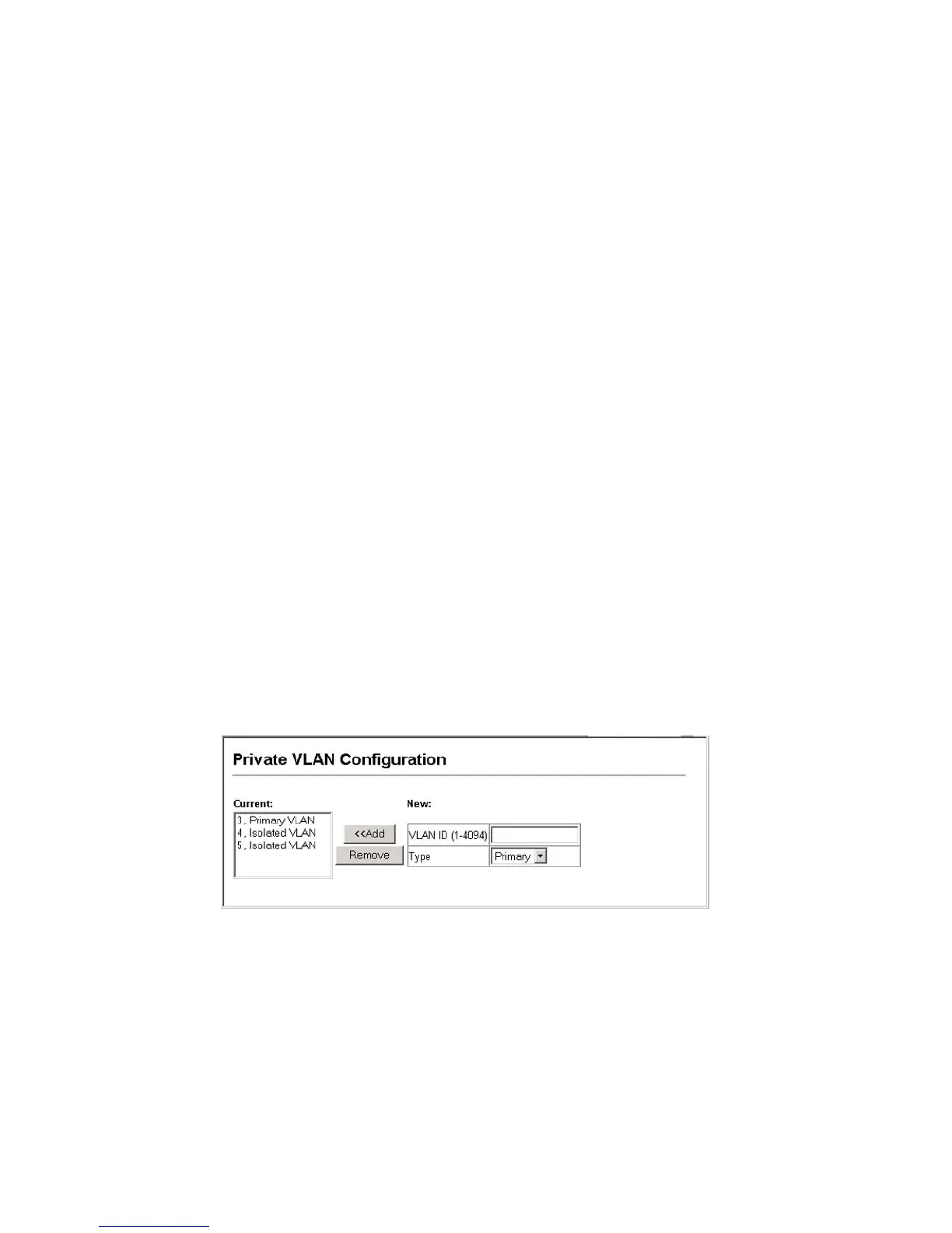 The Private VLAN Configuration page is used to create/remove primary or