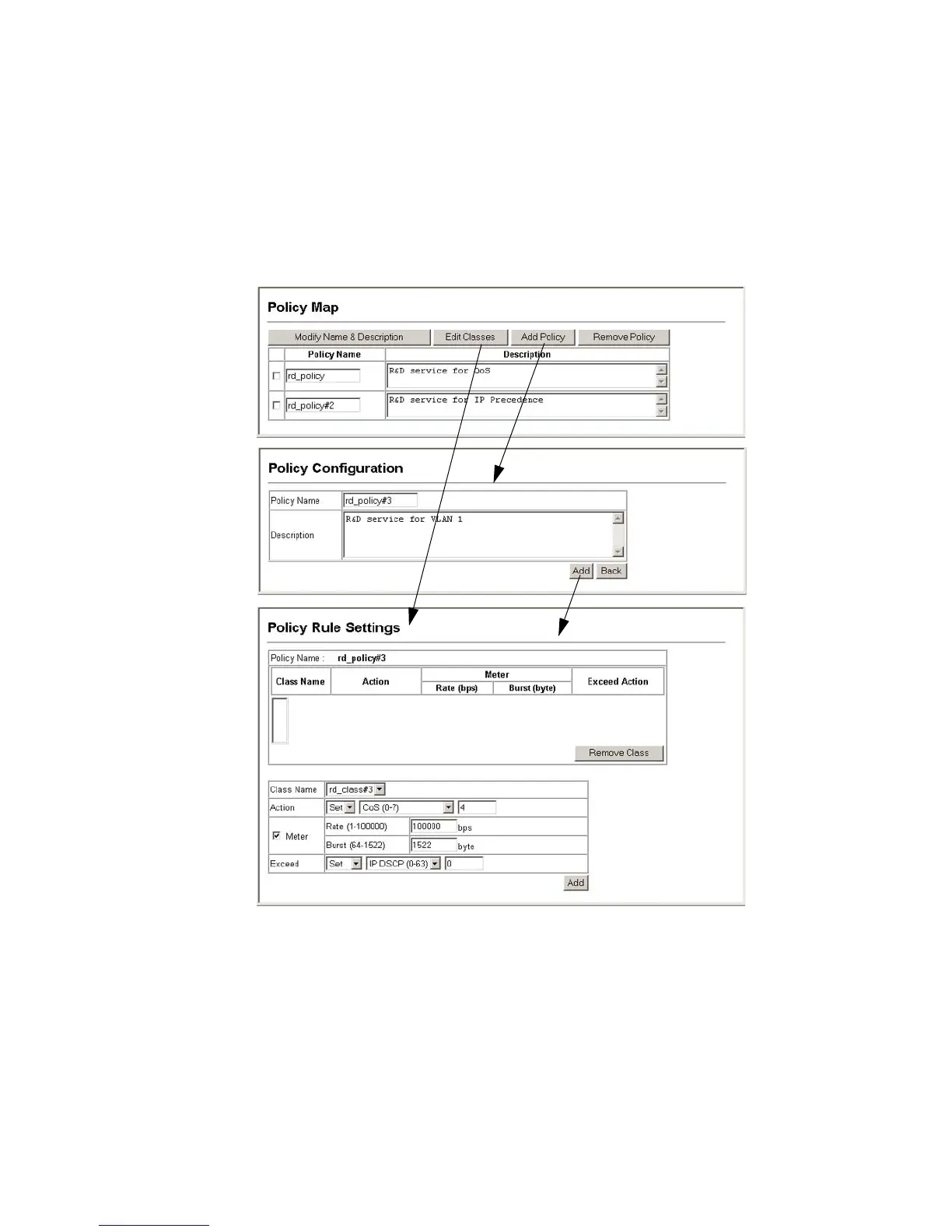 To add a new policy map click Add Policy. To configure the policy rule settings