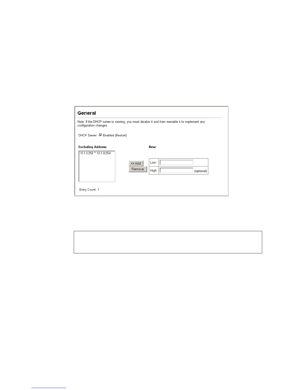 Console(config)#ip dhcp excluded-address 10.1.0.250 10.1.0.254