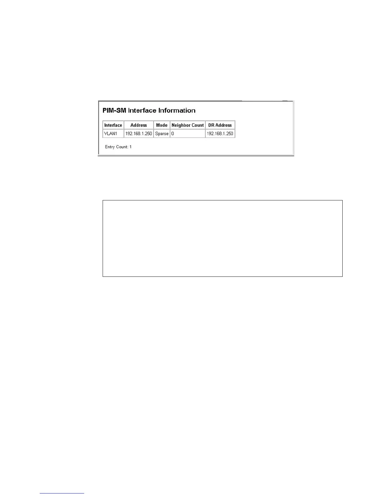 CLI – This example shows the PIM-SM interface summary for VLAN 1.