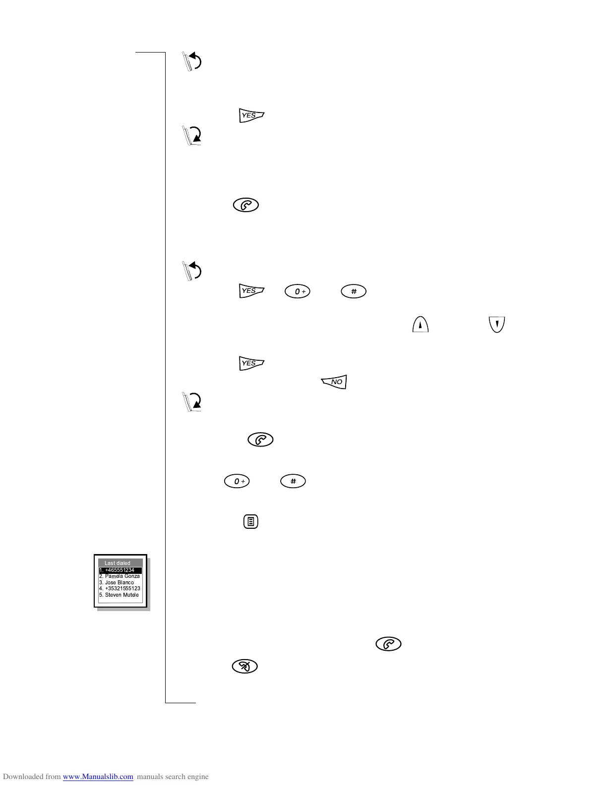 The display shows the last dialed numbers list with the last