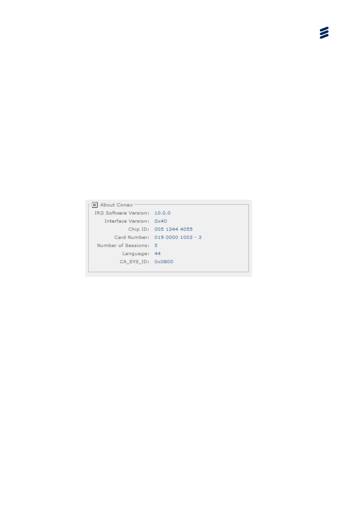 This section shows a summary of any Conax specific information which might be