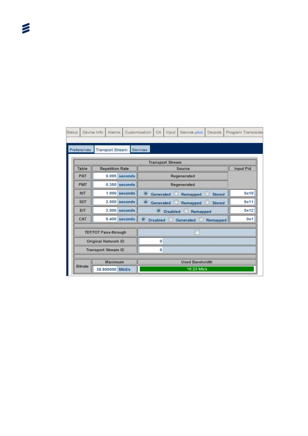 The Transport Stream table enables the entry of Repetition Rates, Input PIDs, bit