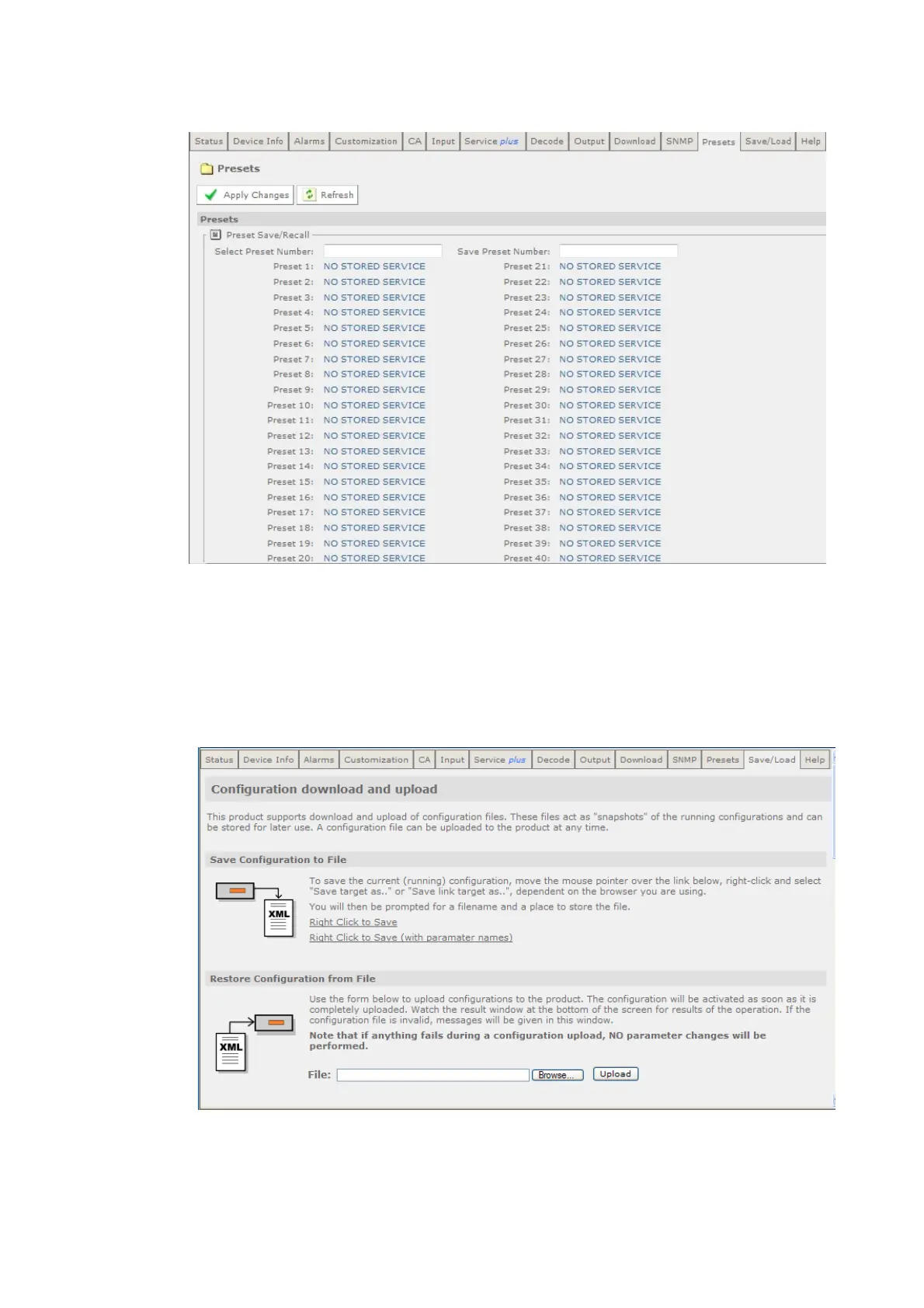 The Save/Load web page provides a range of configuration download and upload