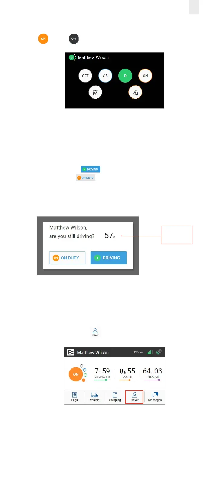 Note: Use the duty status icon to change your duty status, if
