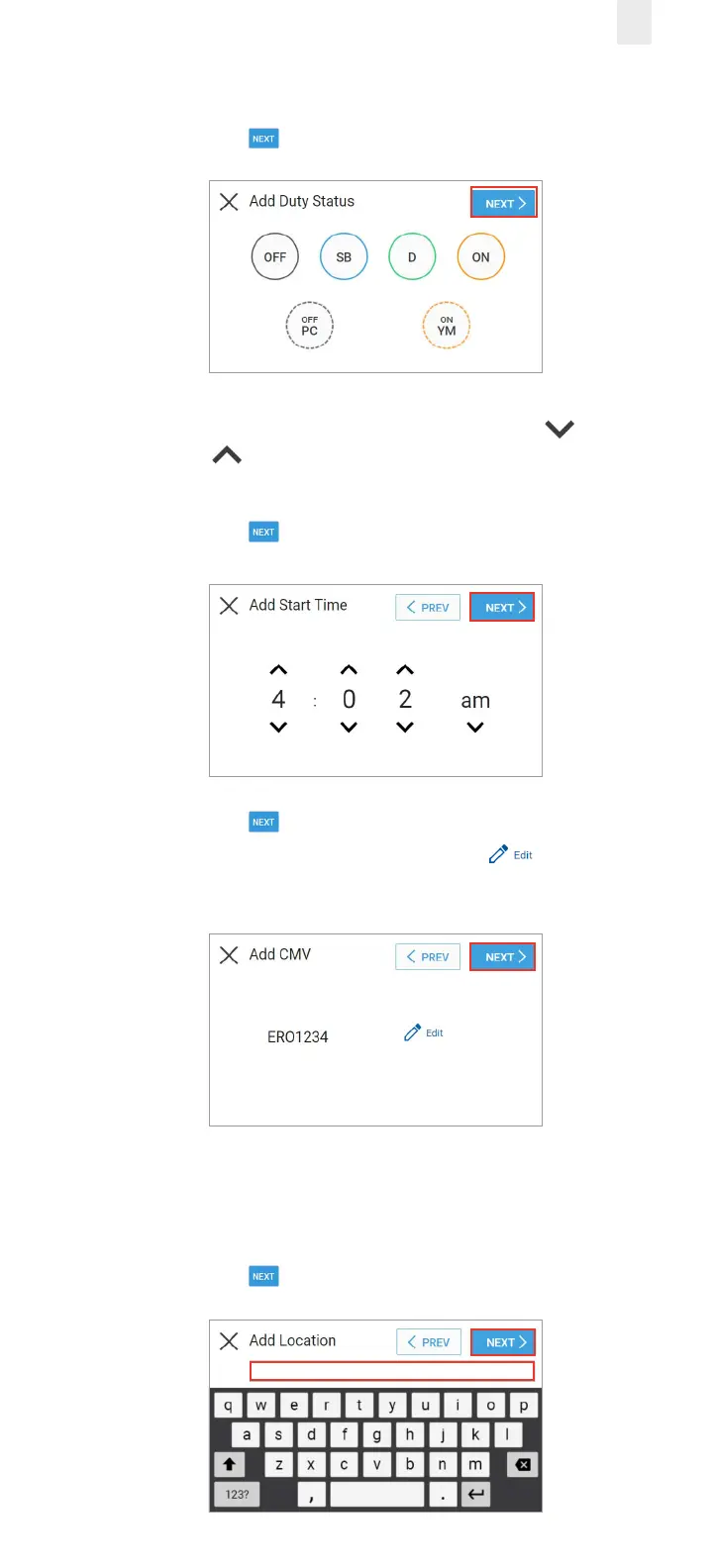8. The Add Start Time screen appears. Tap the Up arrow