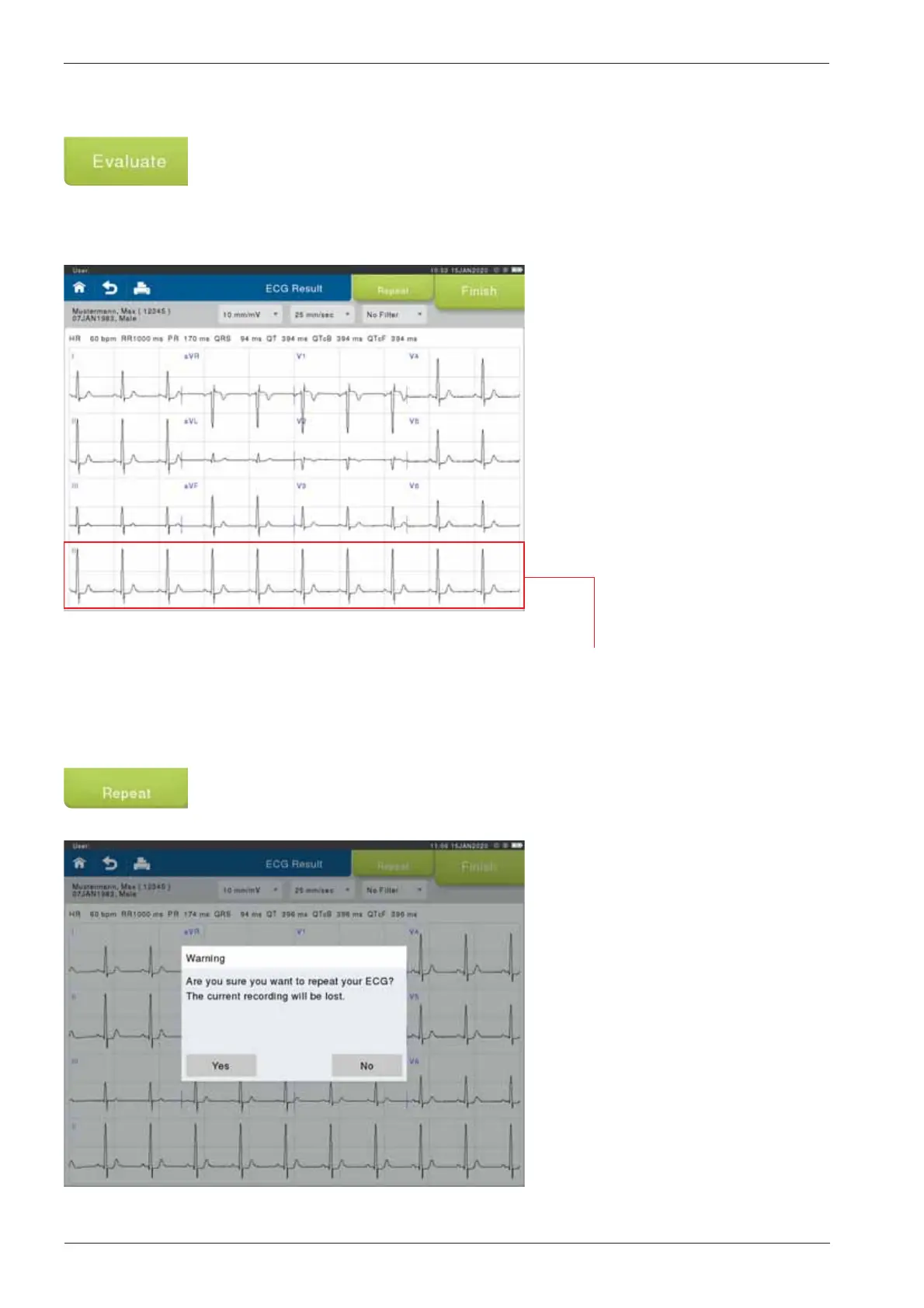 noise, press <Evaluate> to end the recording. The ECG Result screen will