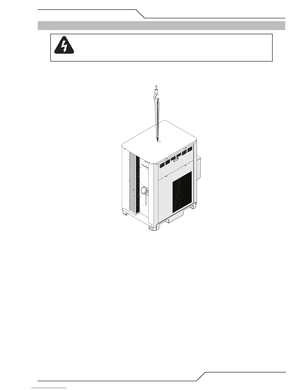 Use a forklift, crane, or hoist to lift the unit off the shipping pallet as shown. Keep the power supply steady and vertical. Do not