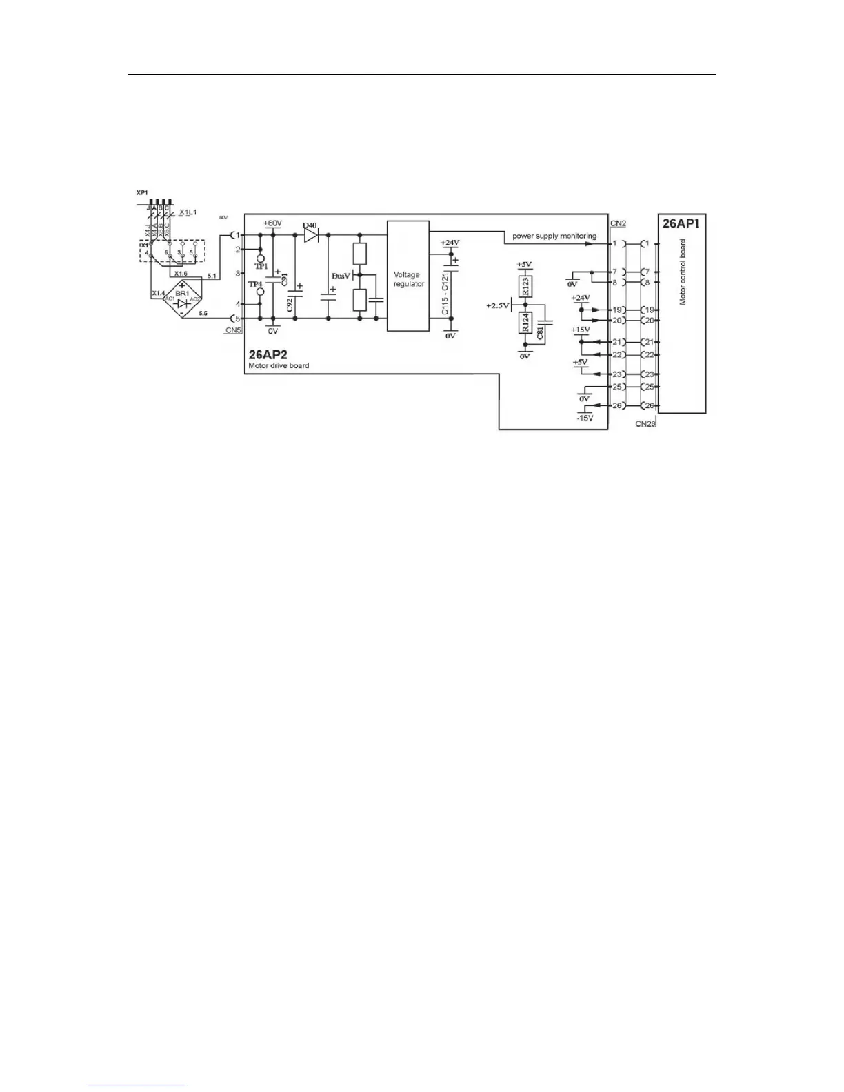 The motor control board, 26AP1, supplies +15 V, -15 V and +5 V to the motor drive board,