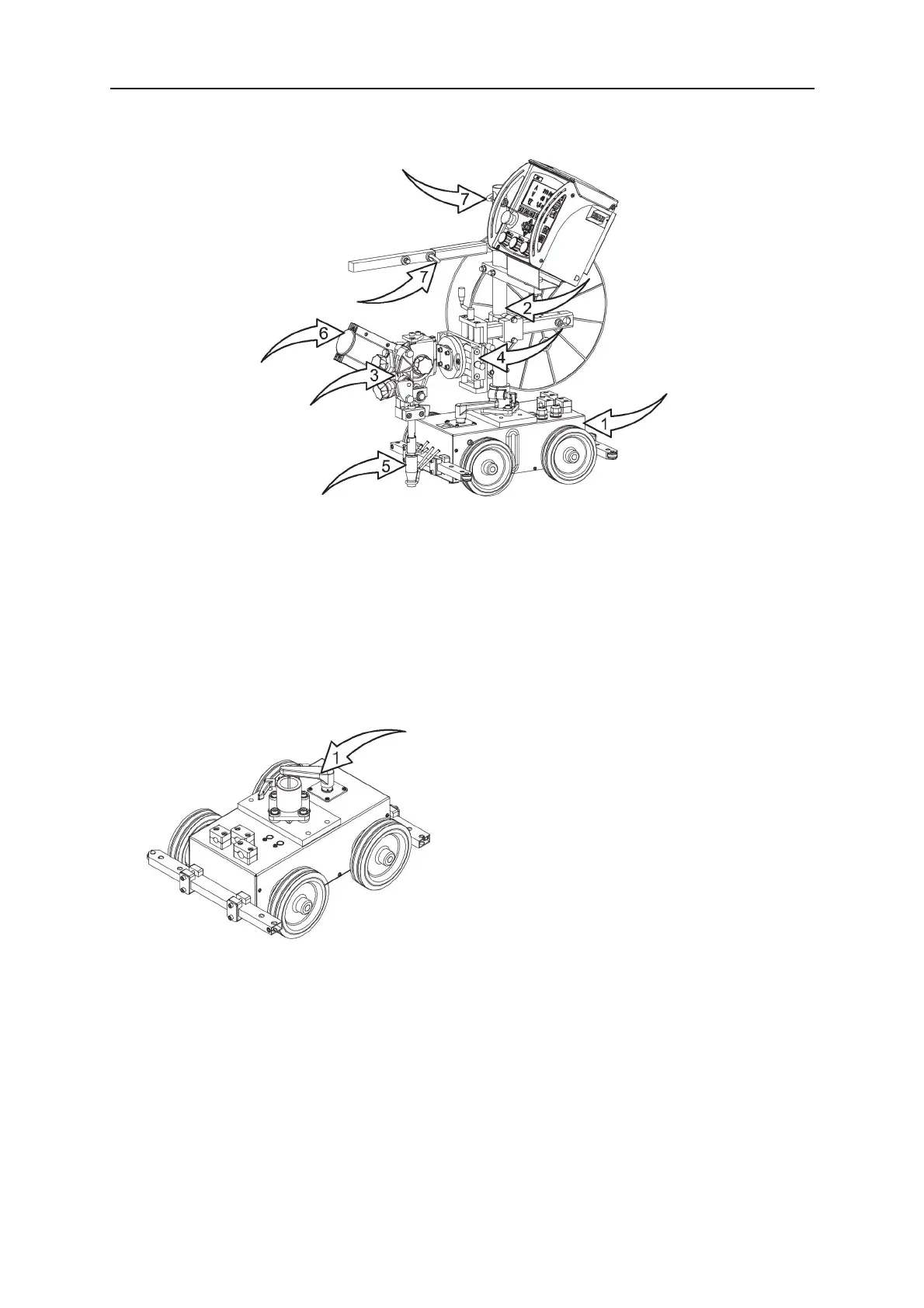 Fit the control unit, wire feed unit and flux hopper, among other things, on the carrier.