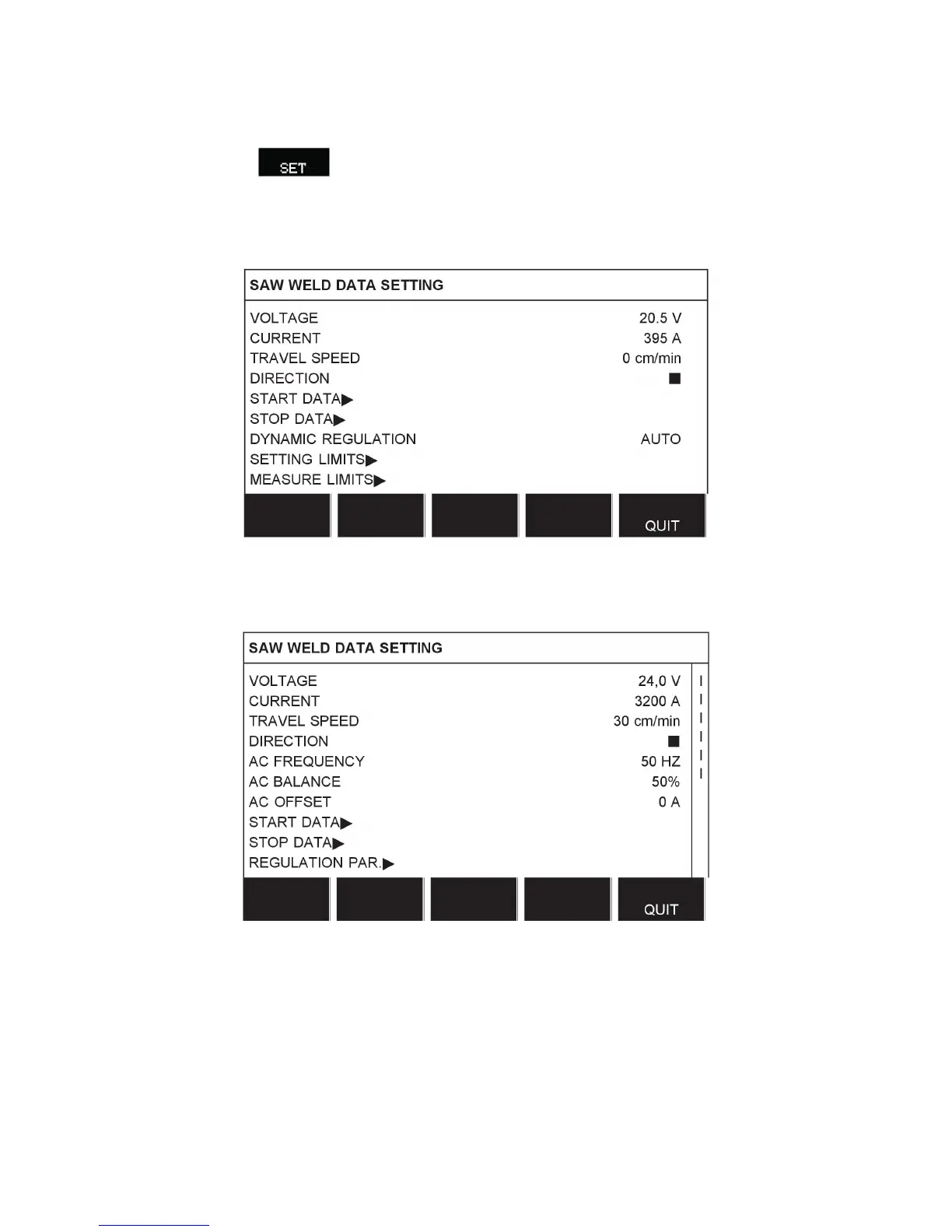 In the weld data setting menu, SET, it is possible to change different welding parameters.