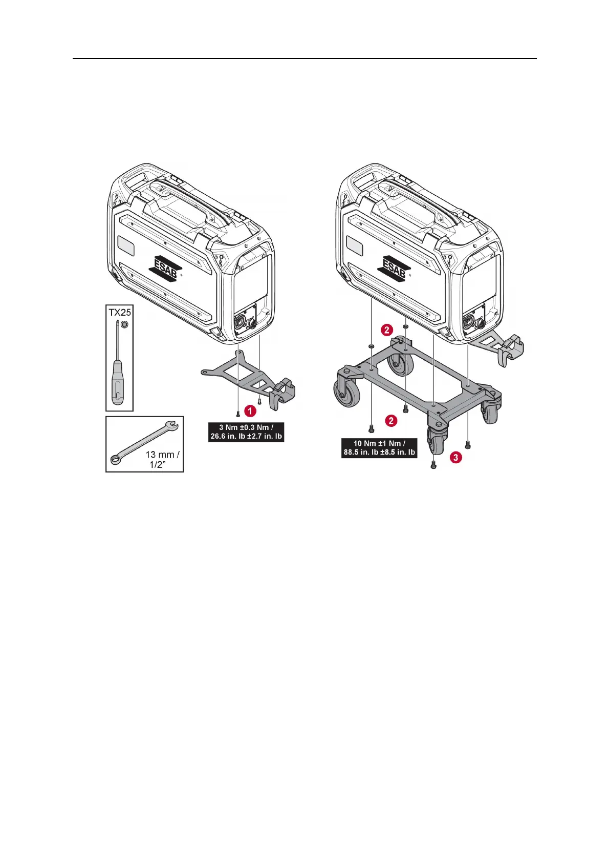 2. Attach the wheel kit to the wire feeder, using the two screw joints near the rear end of