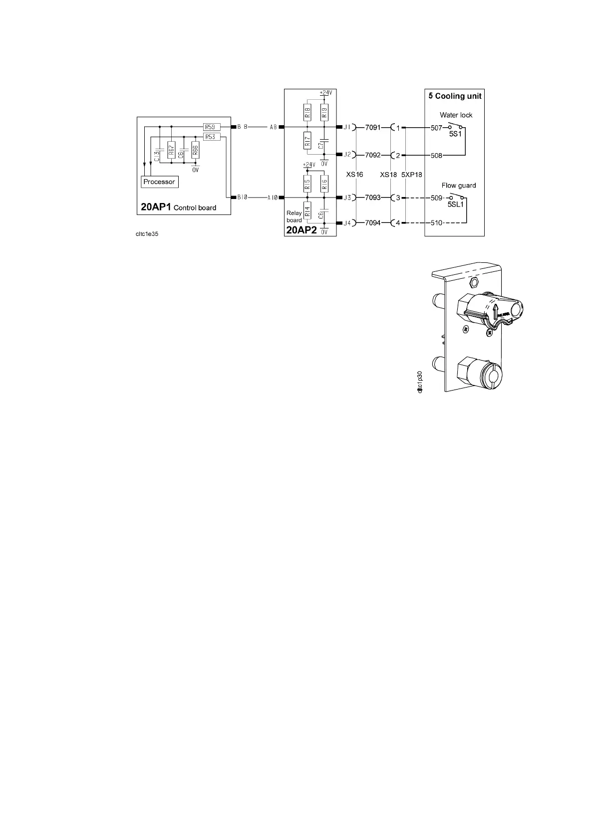 Contact 5SL1 in the flow guard closes when the water