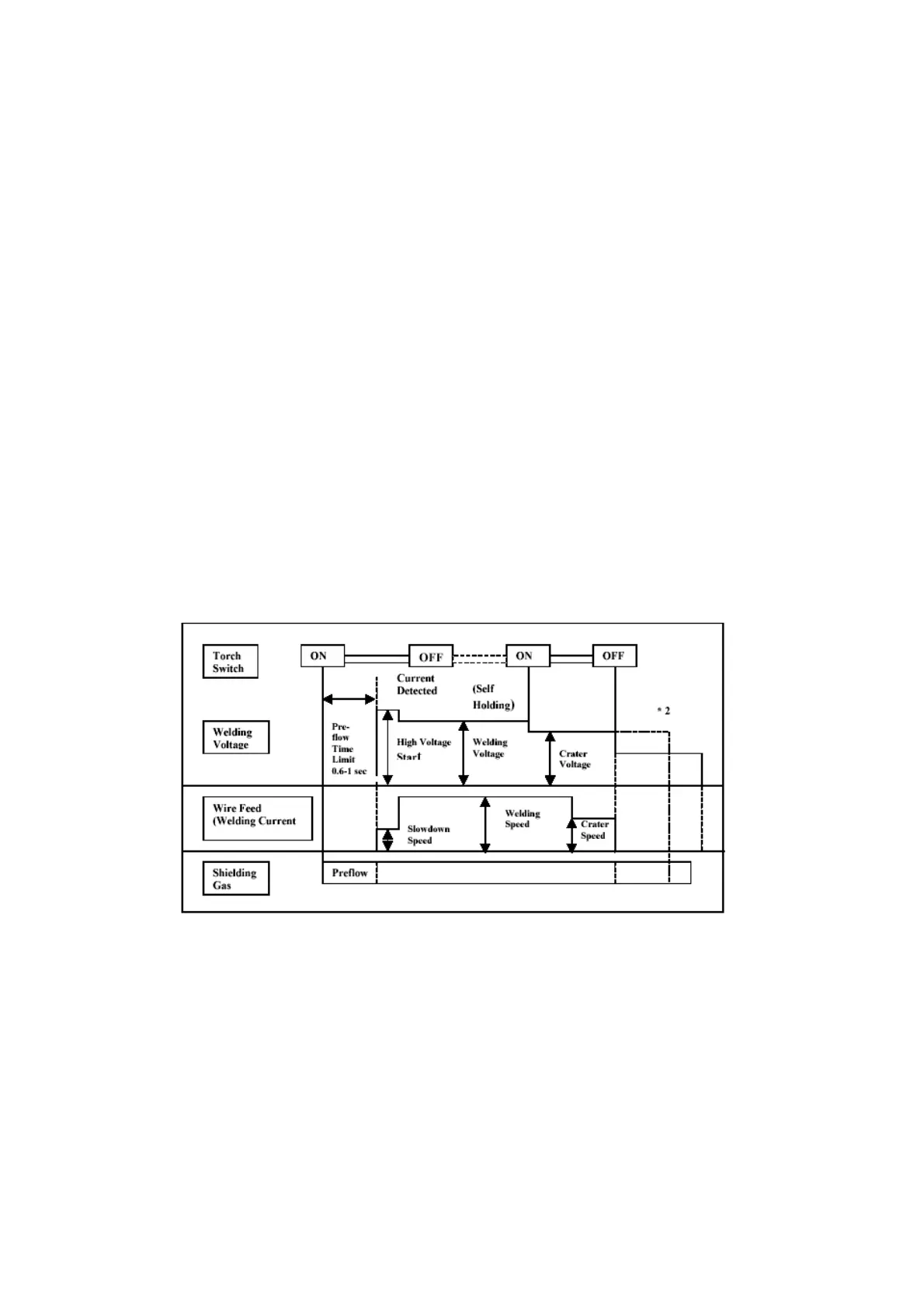 1. When the pre-flow is turned ON, the welding voltage and wire feed action is
