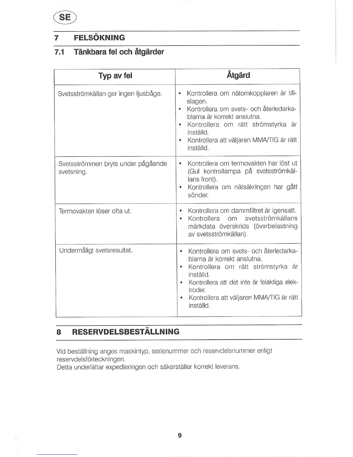 ESAB Caddy 150 - FELSÖKNING; Troubleshooting Common Issues; RESERVDELSBESTÄLLNING