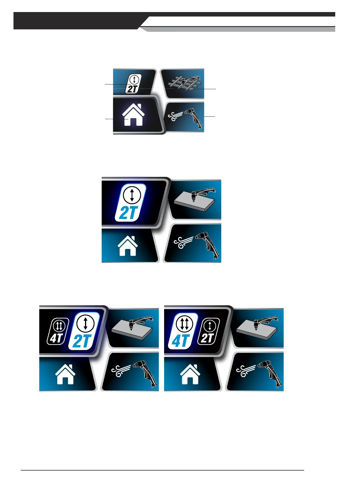 and 4T (latch mode). In 2T mode, the torch trigger must remain depressed for the cutting output to be