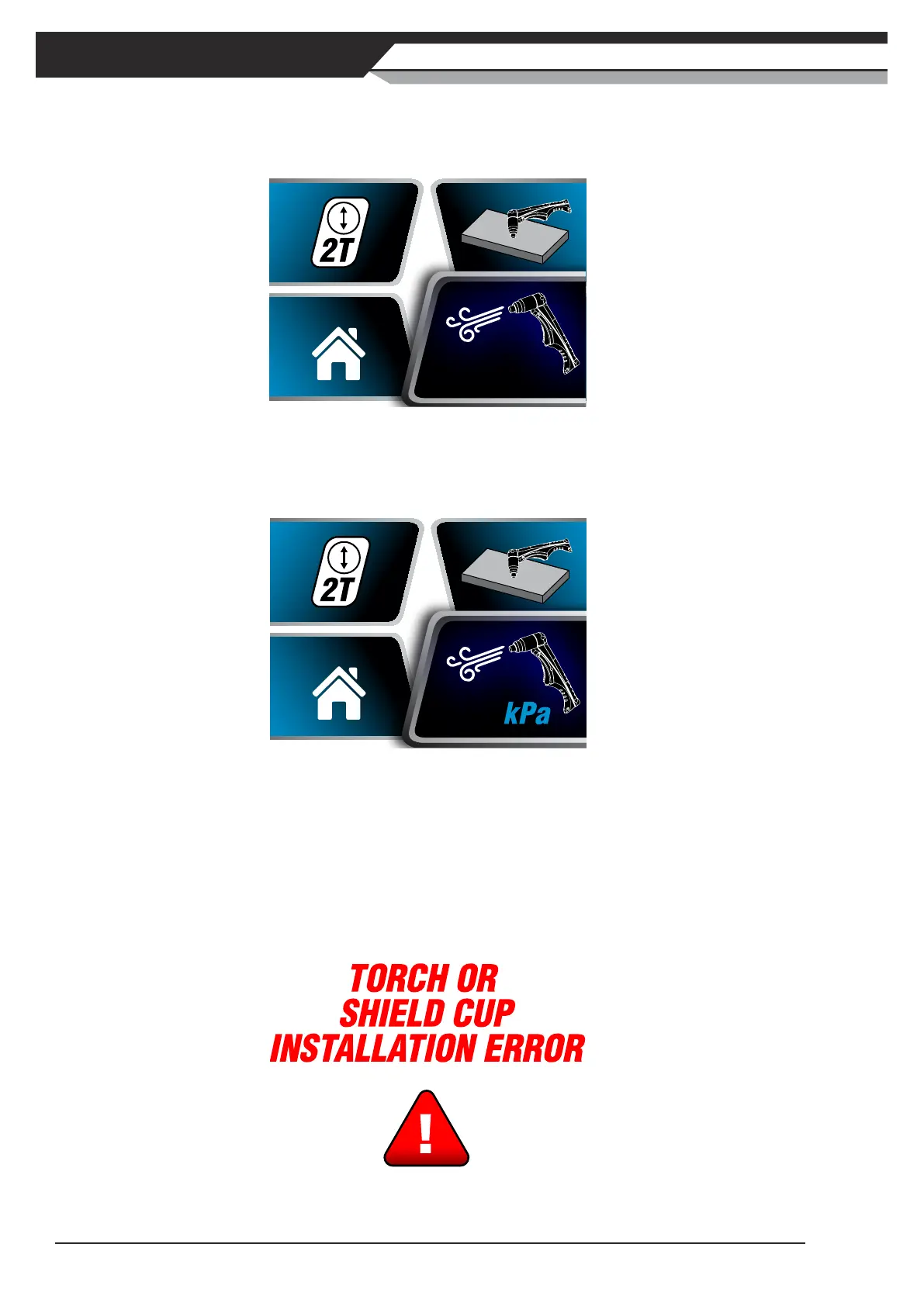 Torch or Shield Cup Installation Error Screen displays when torch or shield cup of torch is not installed correctly.
