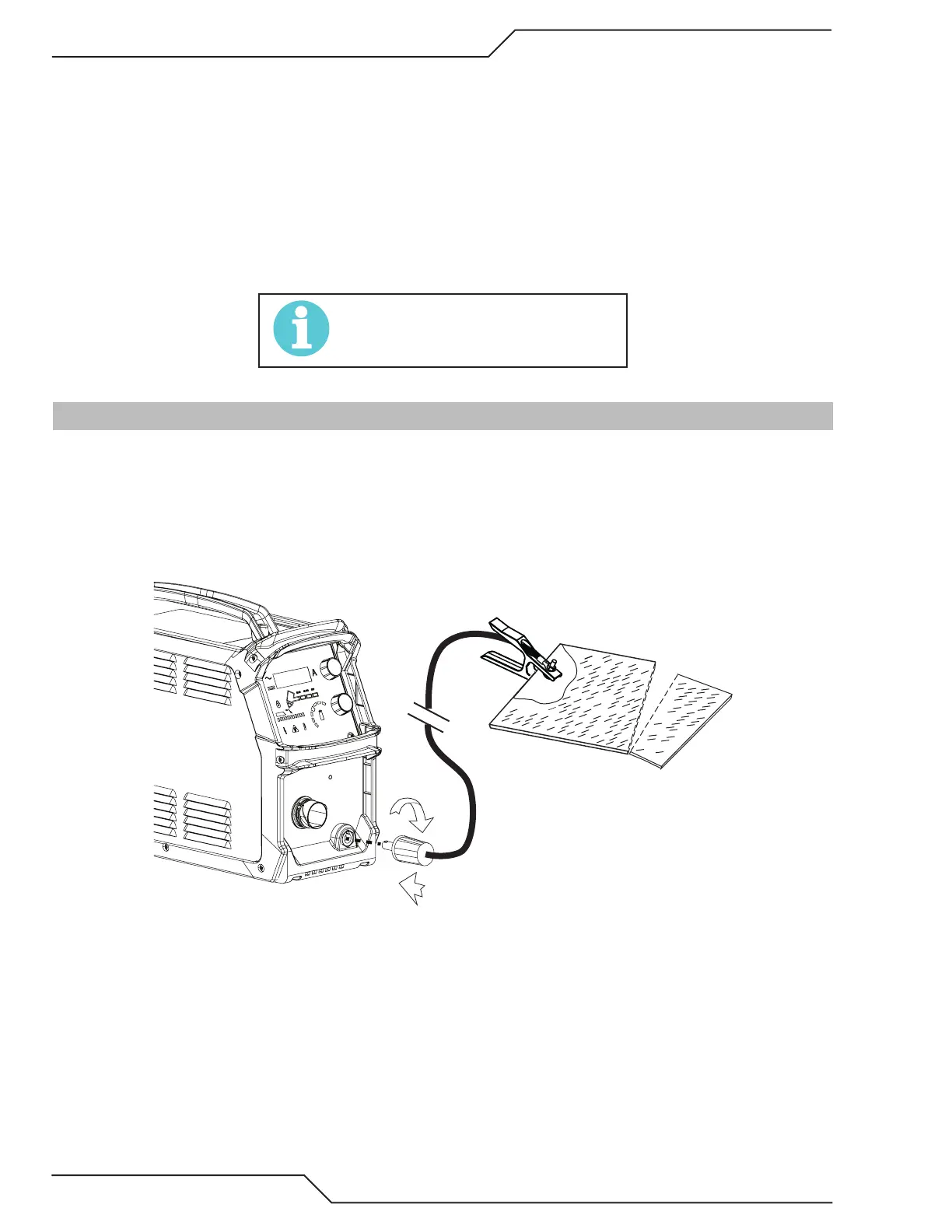 1. Attache the Dinse type connection of the work lead to the power supply front panel as shown below. Push