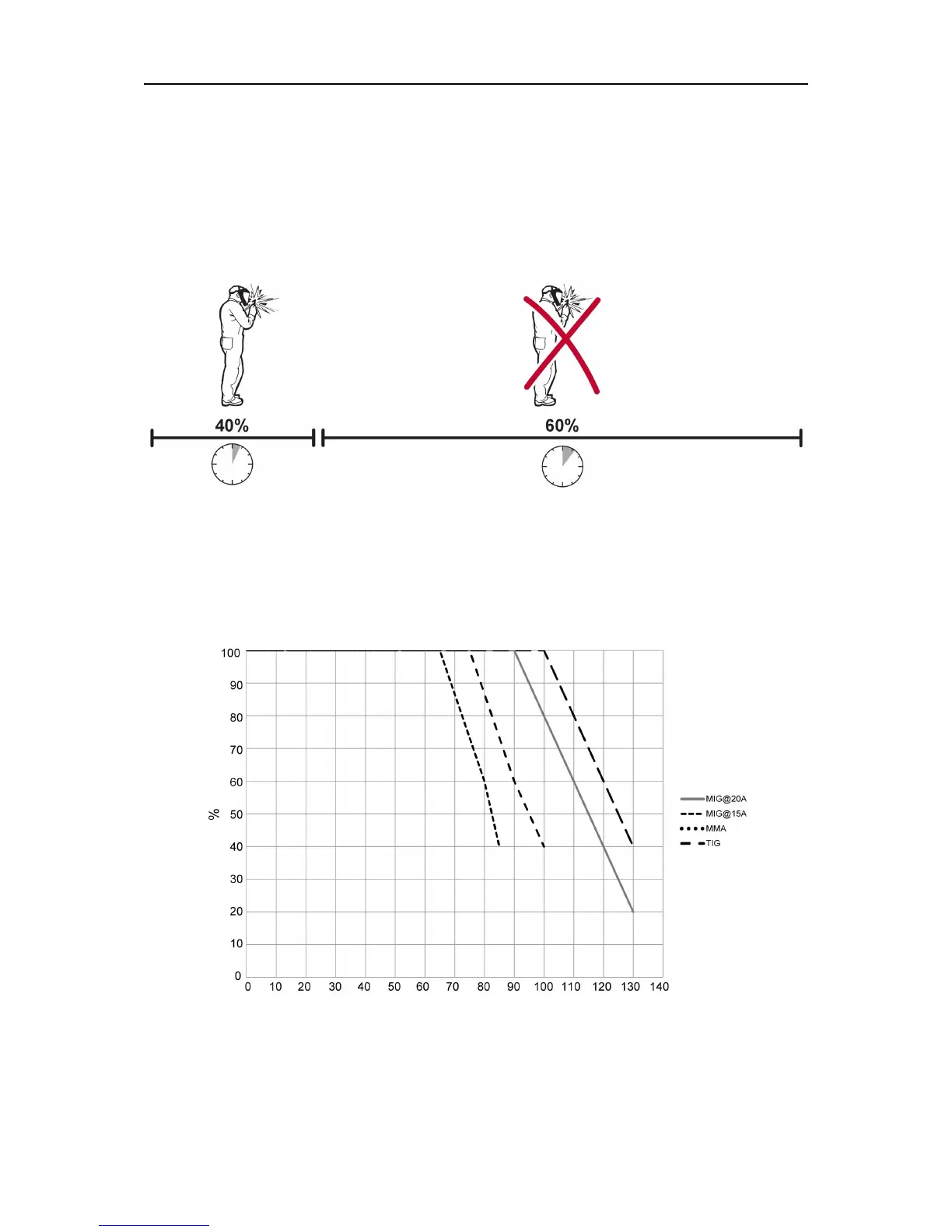 A different combination of duty cycle and welding current can be selected. Use the graphs