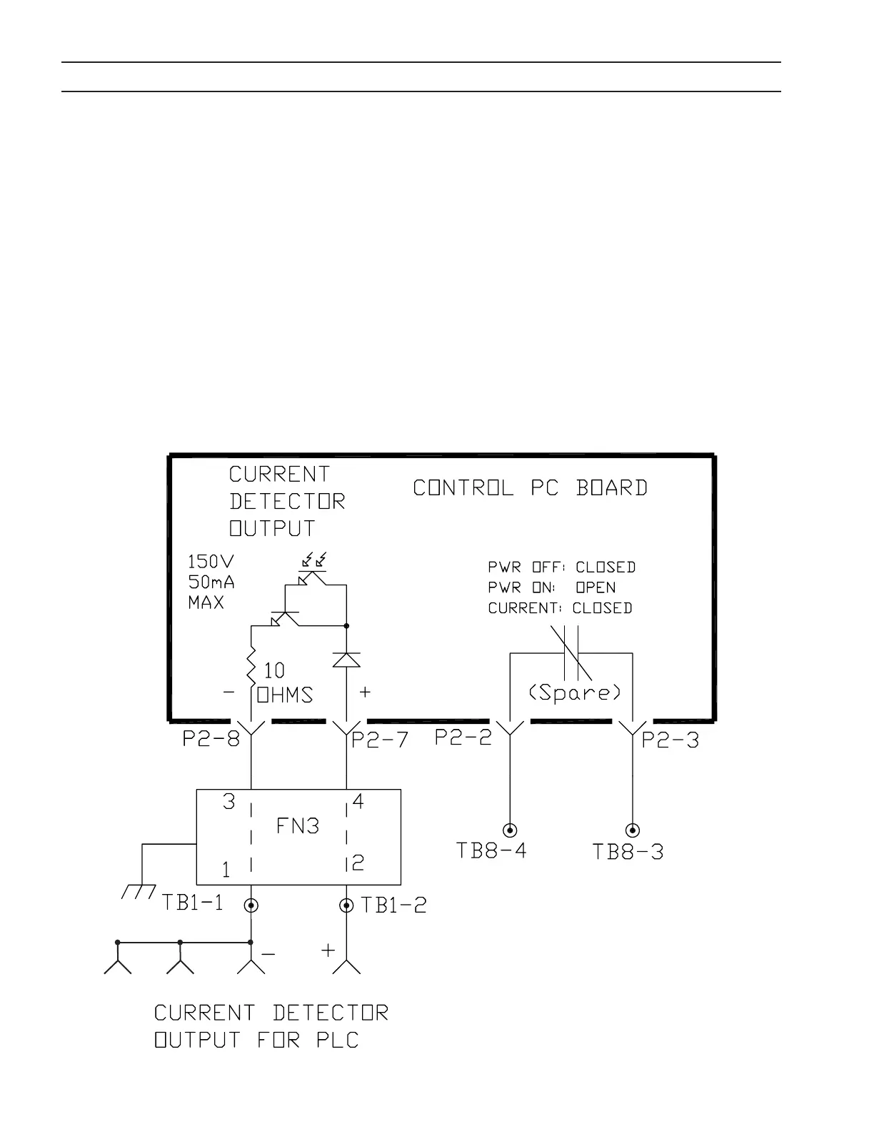 A second current detector output is available at TB8-3 and TB8-4. This output is supplied by an isolated relay contact rated