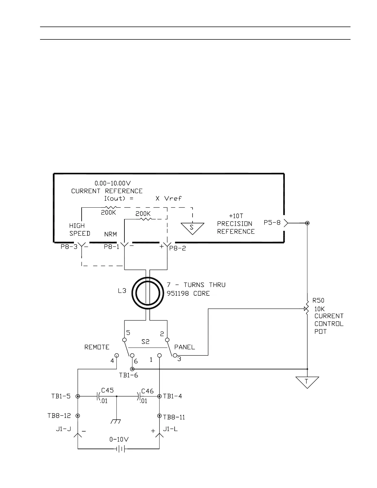 either the Current Control Potentiometer on the front panel or from a remote source. In the “Panel” position, S2, the Panel