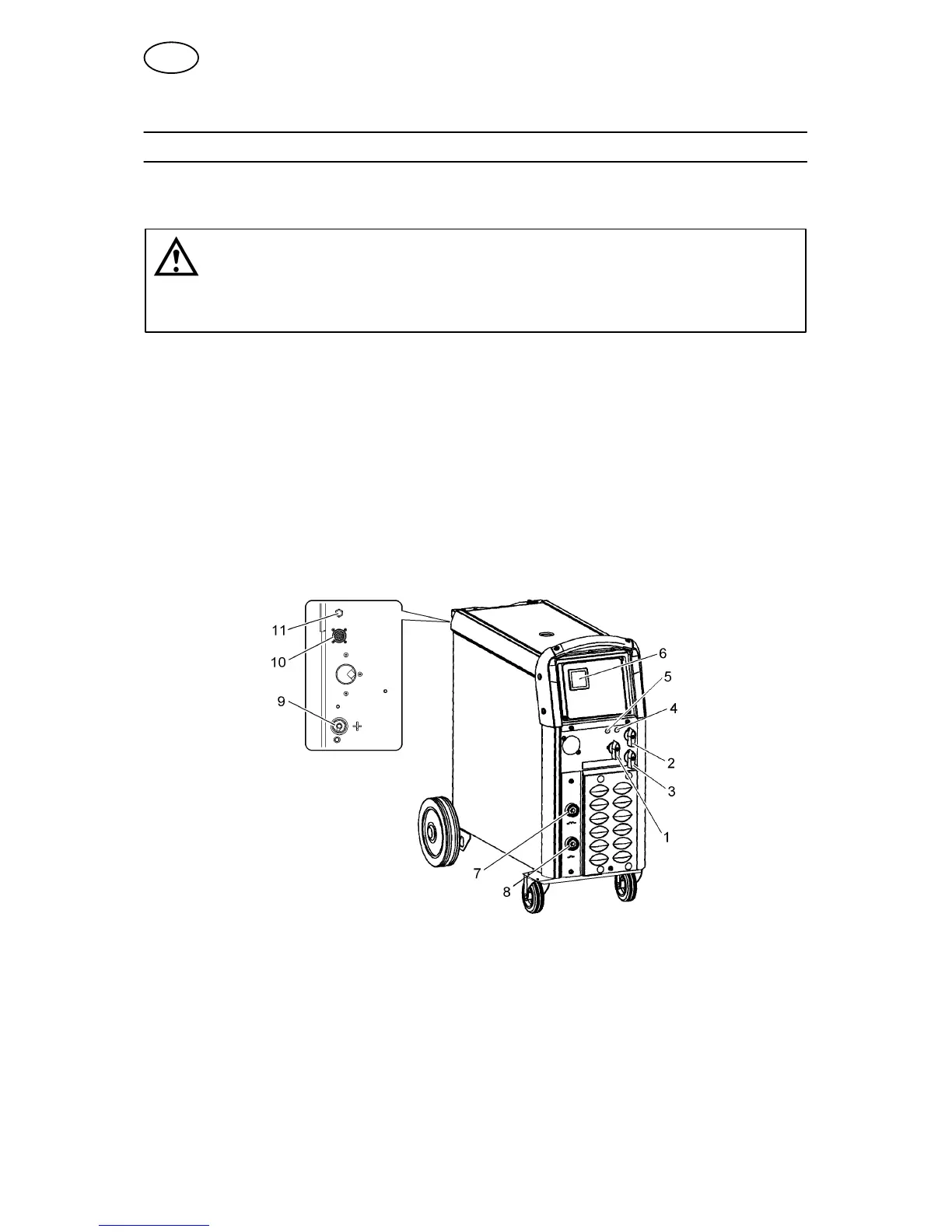1 Mains supply switch 7 Connection for return cable (–), high induc-