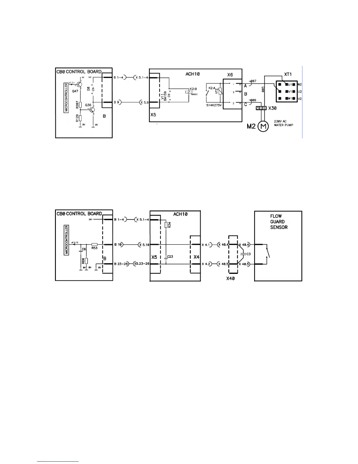 Water pump is controlled by microcontroller on board CB0 via transistors Q47,Q36,