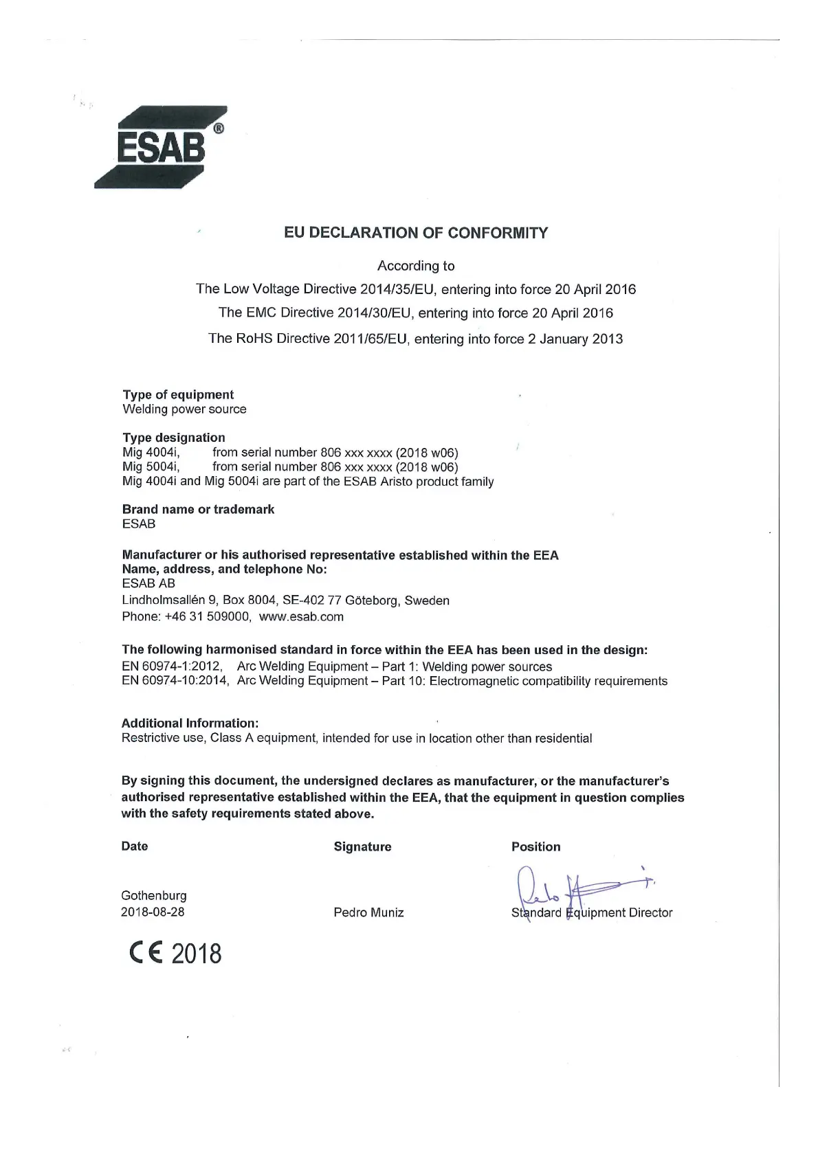 ESAB Mig 4004i - EU DECLARATION OF CONFORMITY; Equipment Type and Designation; Manufacturer and Standards Compliance; Declaration of Conformity Statement