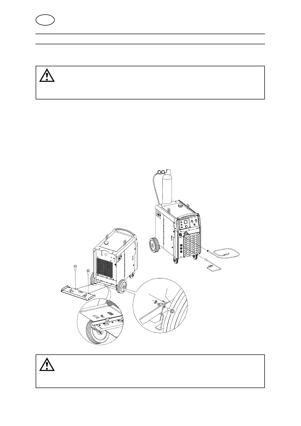 Bakhjulen måste flyttas till bakre läget innan utrustningen kan tas i bruk.