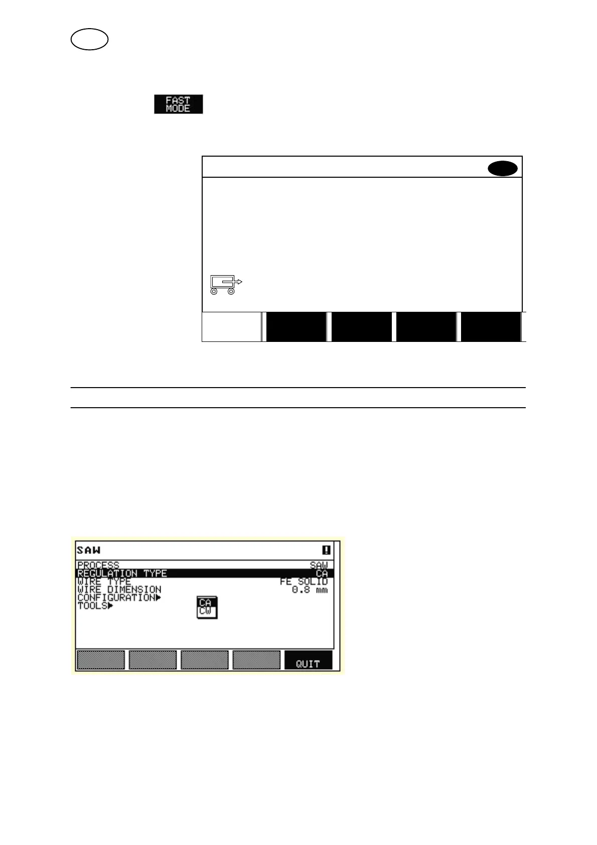 pressing ENTER. Choose between constant welding current CA or constant wire