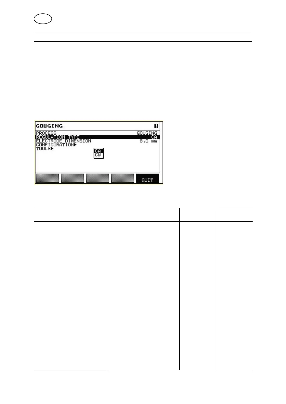 ENTER. Choose between constant welding current CA or constant wire feed CW,