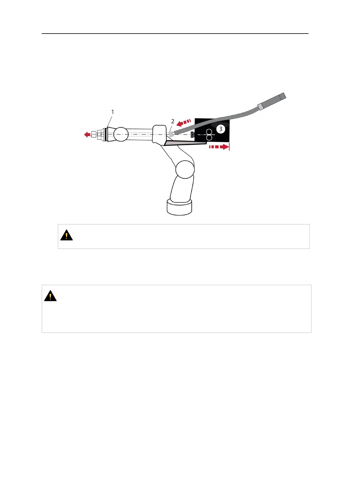 3. Insert the cable assembly with the coupling (2) first into the robot arm and feed it