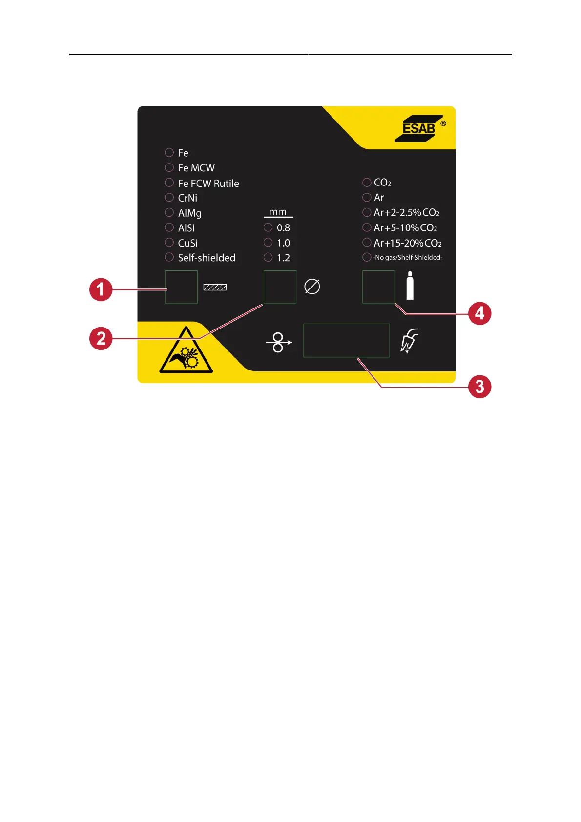 2. Wire diameter selection button 4. Gas selection button (Synergic variant only)