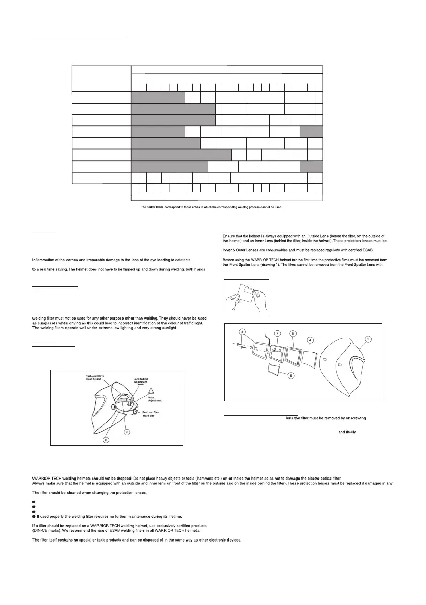 to the comfort and safety of the welder. WARRIOR TECH welding helmets may be used only in connection with arc welding. The chart below shows how to choose the most suitable shade level: