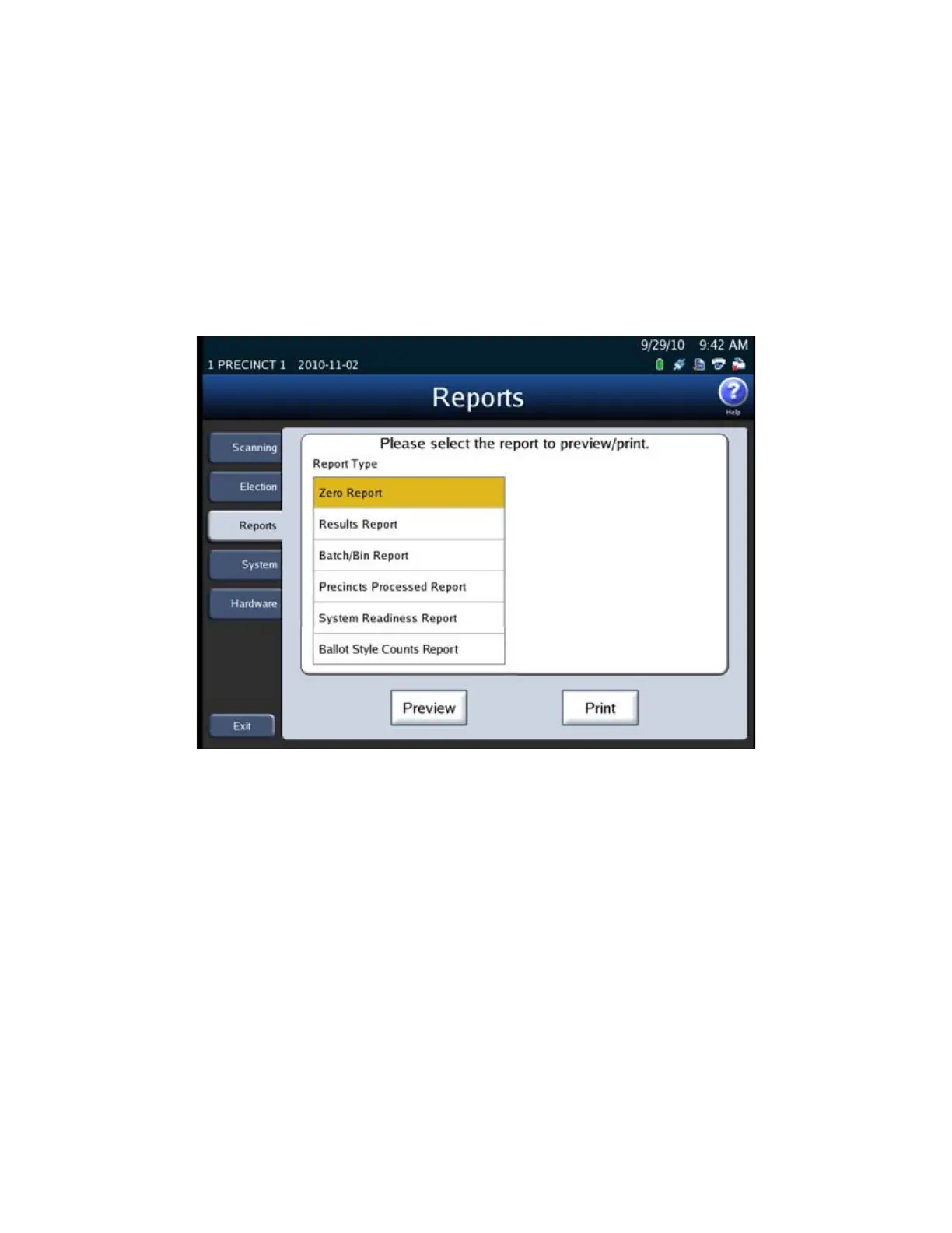 2. Press Preview to the view the report on the touch screen, or press Print to print the