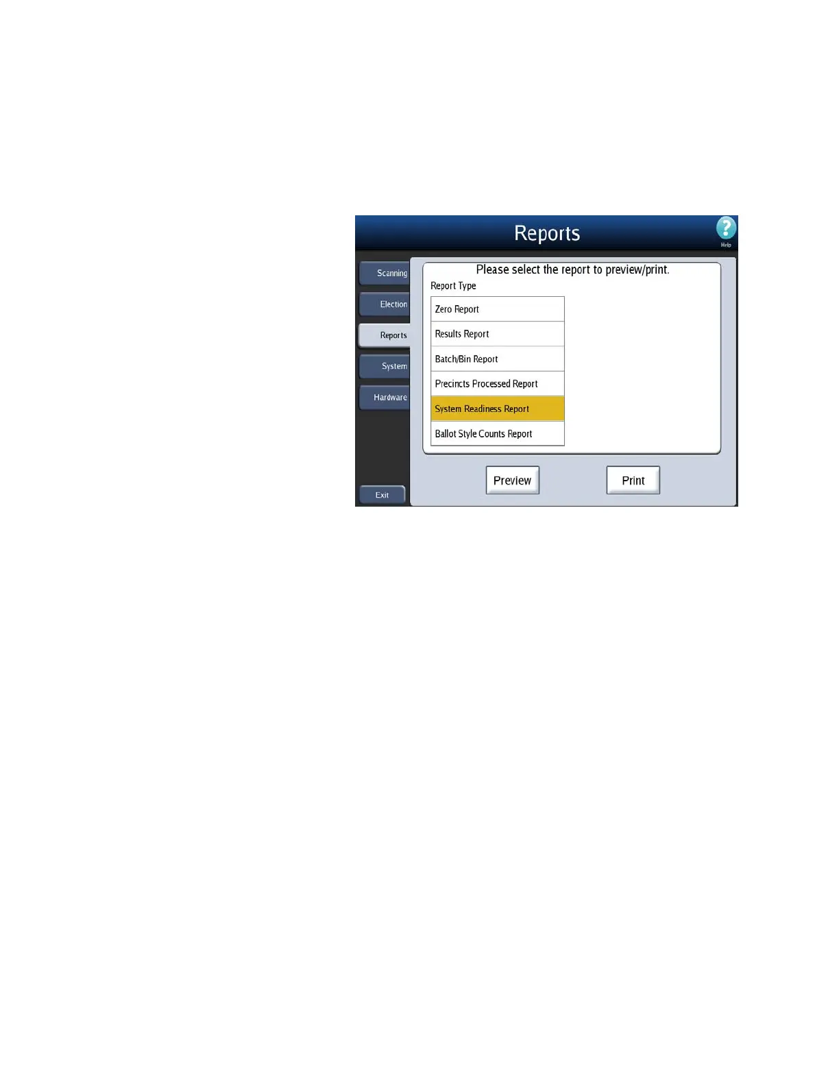 1. From the Reports menu, press System Readiness Report in the Report Type field.