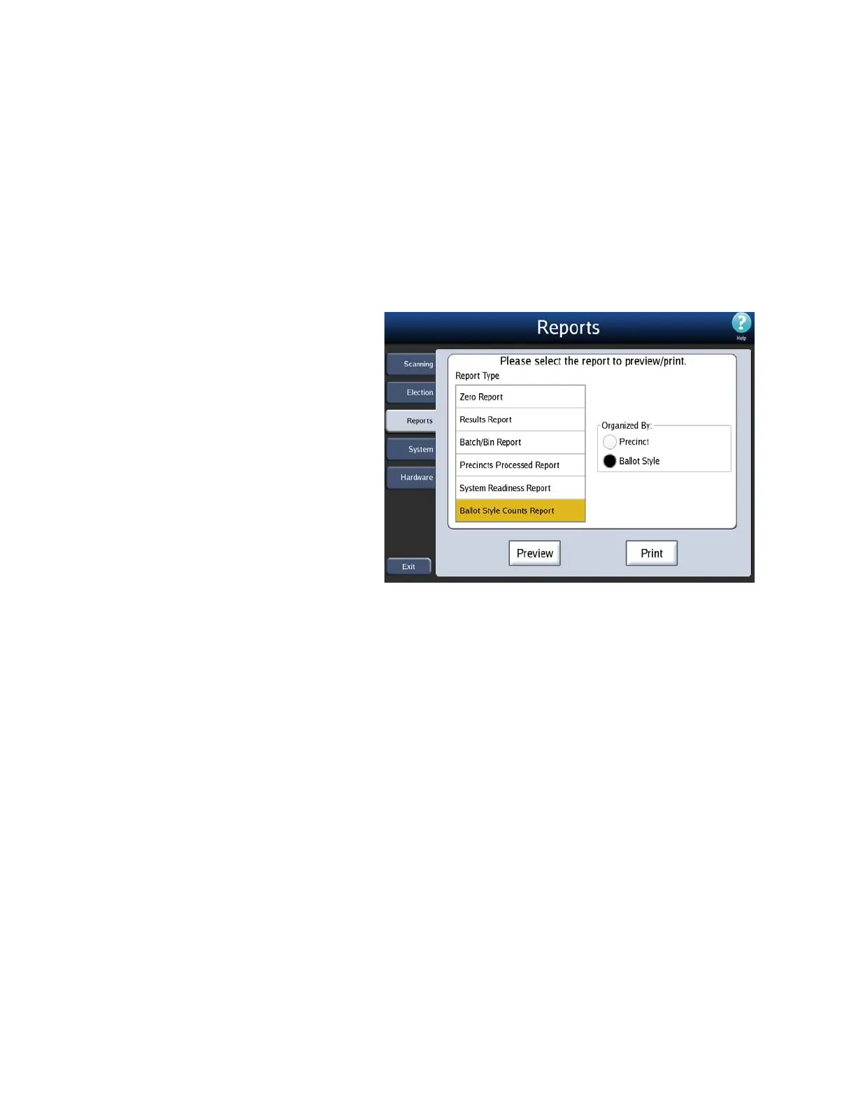 1. From the Reports menu, press Ballot Style Counts Report in the Report Type field.