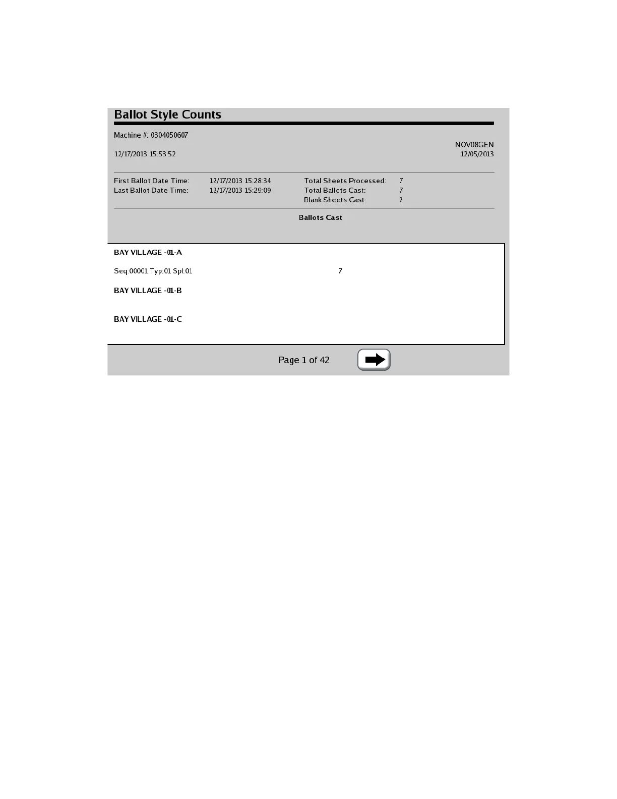 The following is an example of the Ballot Style Counts Report.