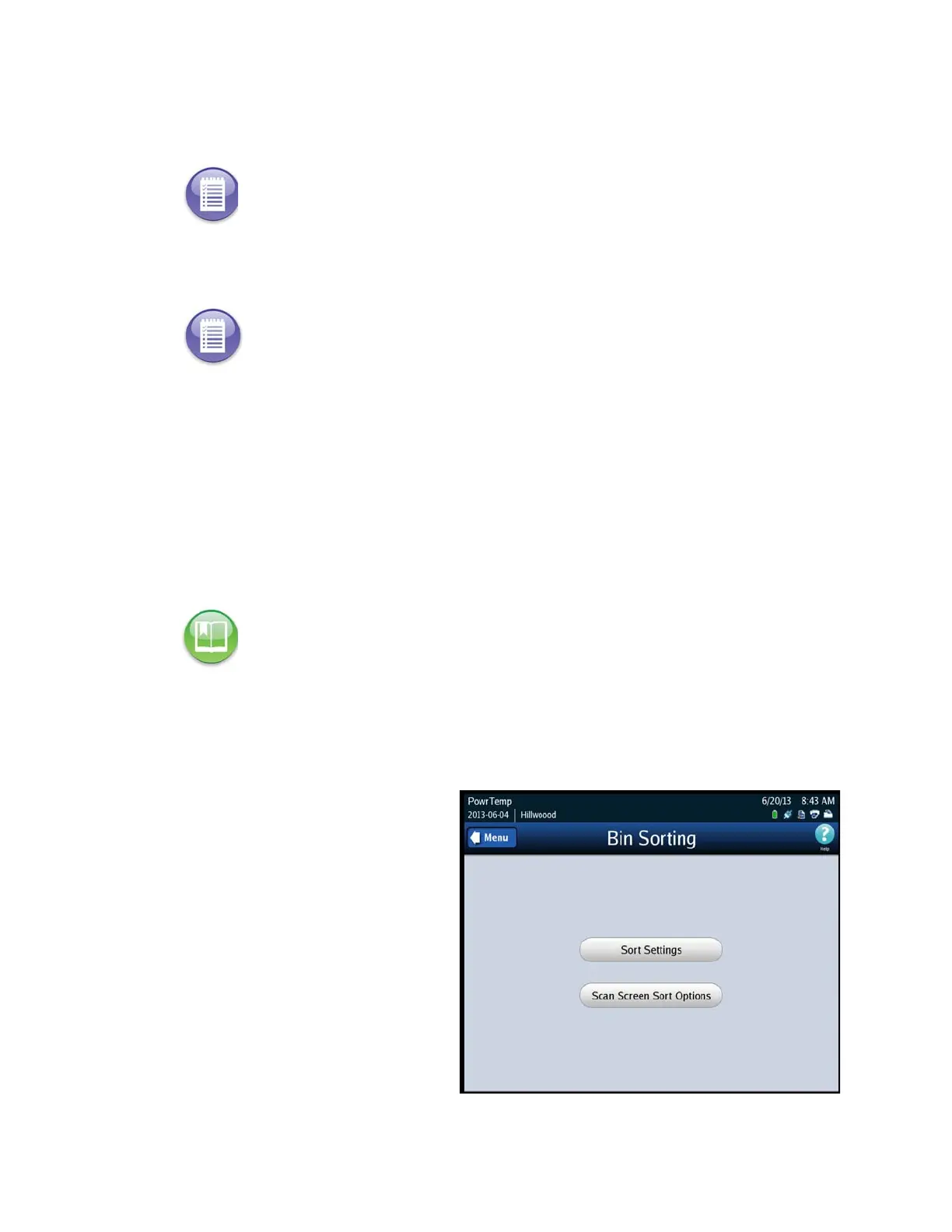 1. Press Bin Sorting on the Configuration screen. The Bin Sorting options screen