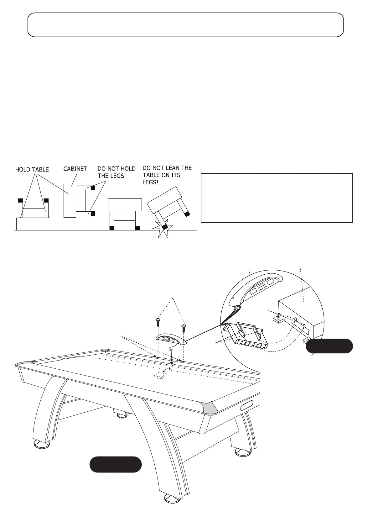Lift the table assembly from the floor with at least six strong adults, turn it over, and set