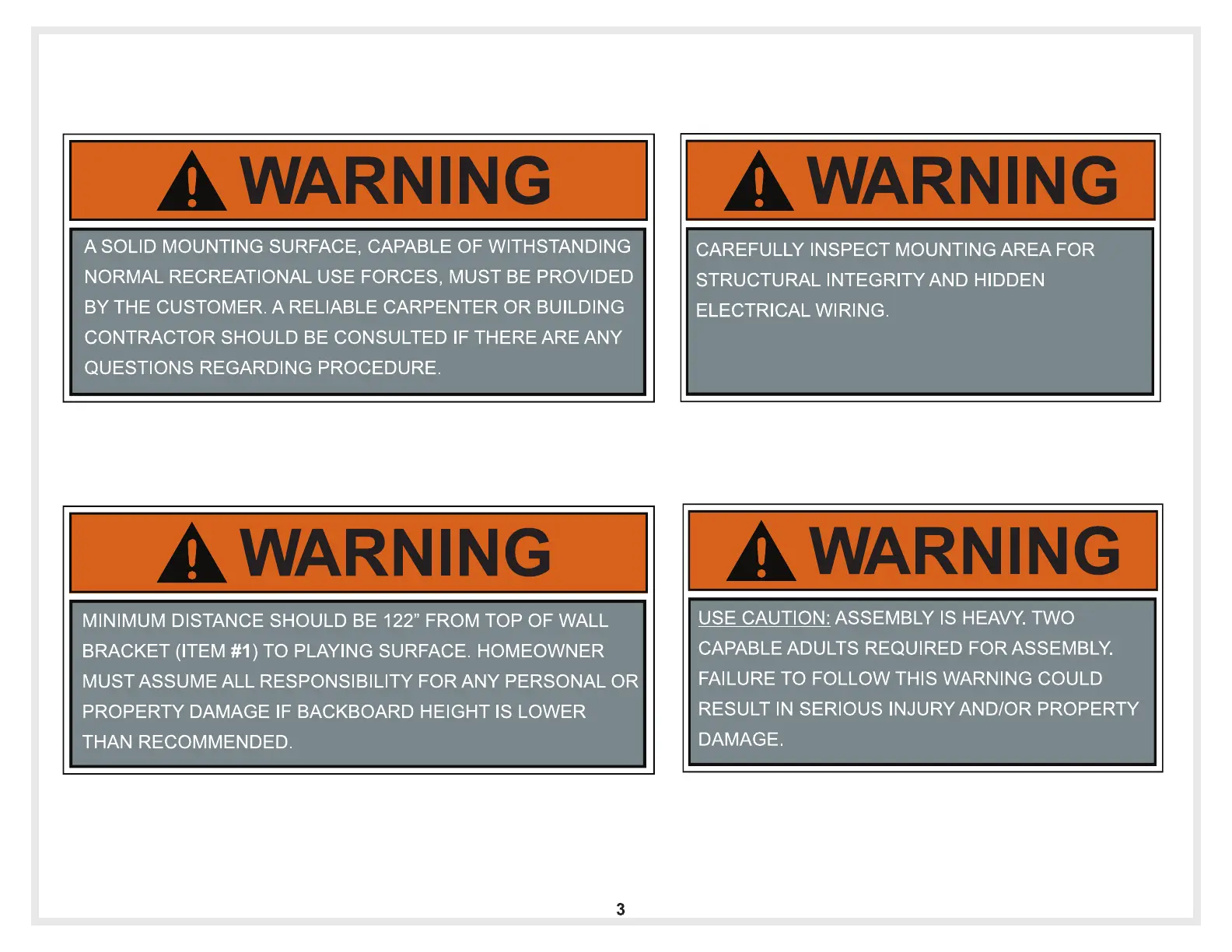 ESCALADE SILVERBACK B8403 - Mounting and Structural Warnings; Wall Mounting Surface & Inspection; Height Clearance and Load Warnings
