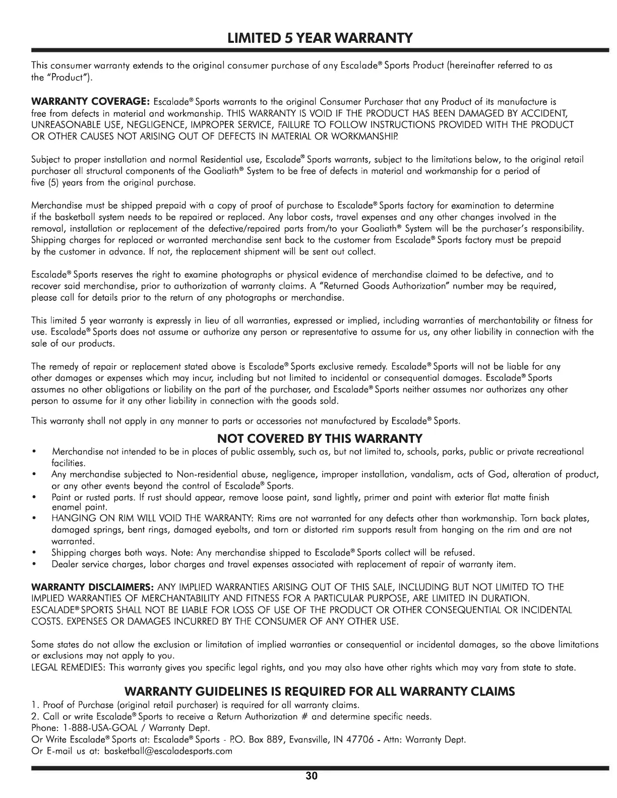 ESCALADE SILVERBACK B8403 - Limited 5-Year Warranty; Warranty Coverage Details; Exclusions from Warranty Coverage; Warranty Claim Procedures