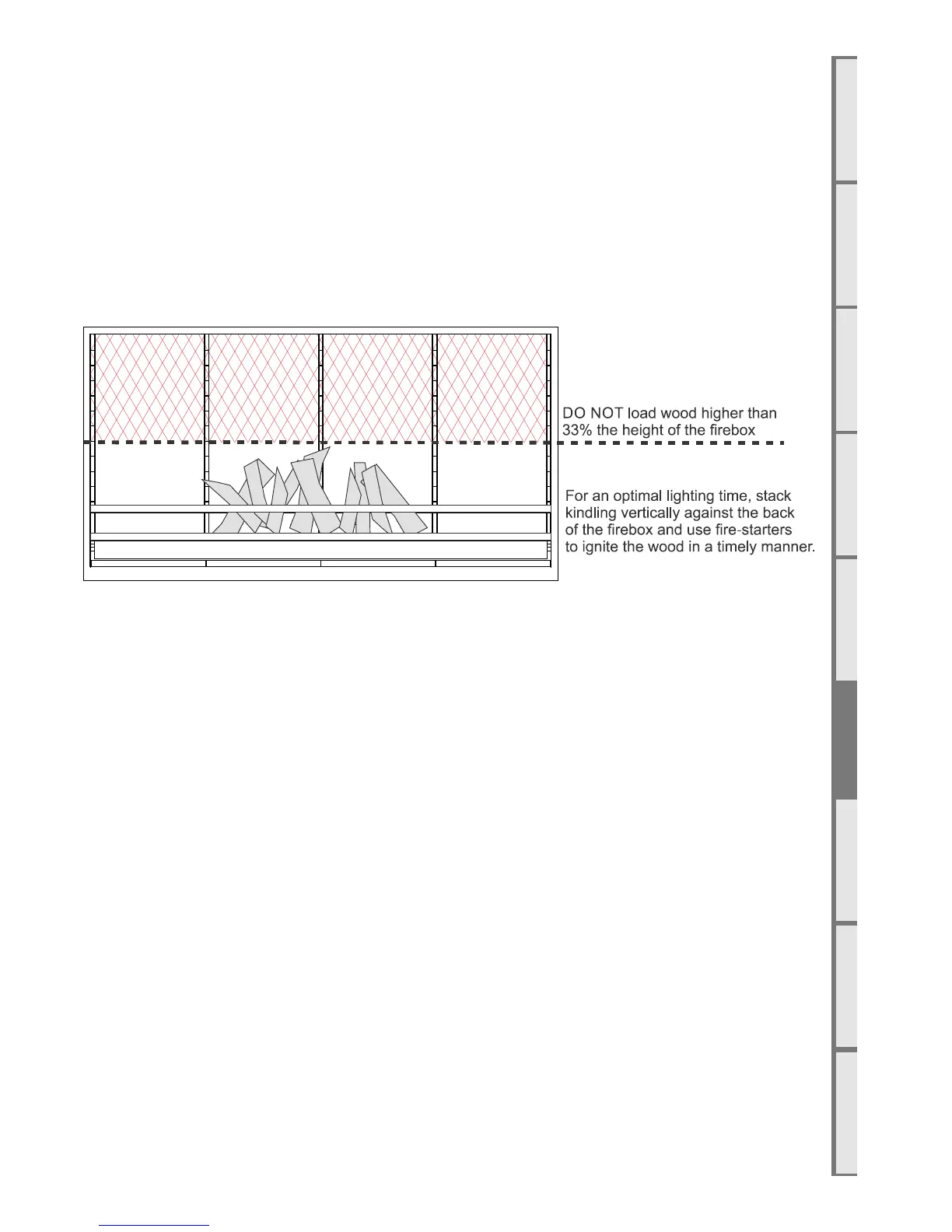 Do not load wood higher than 1/3 (33%) of the height of the firebox.
