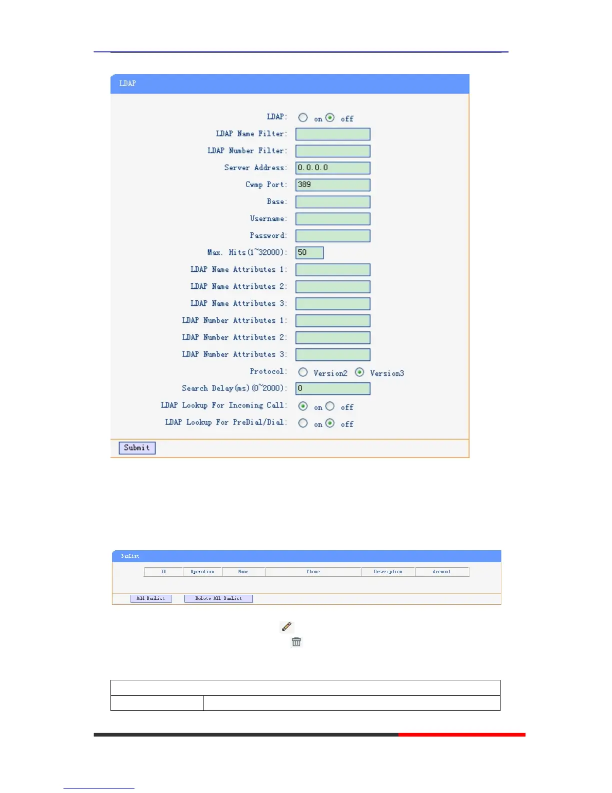 You can add, edit and delete banlist in a phone book on web page of 2xx SERIES..