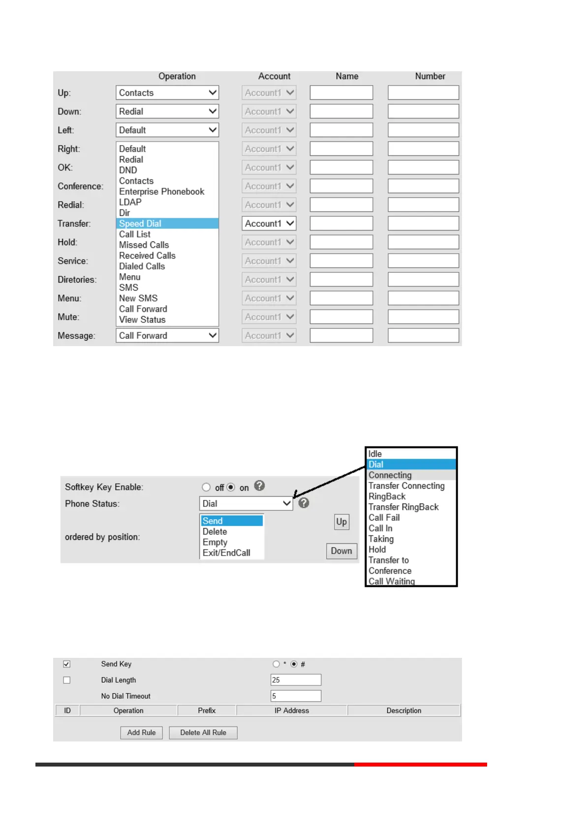 many all kinds of status. As below example, when you are dealing with someone, the LCD display soft key is Send \Del