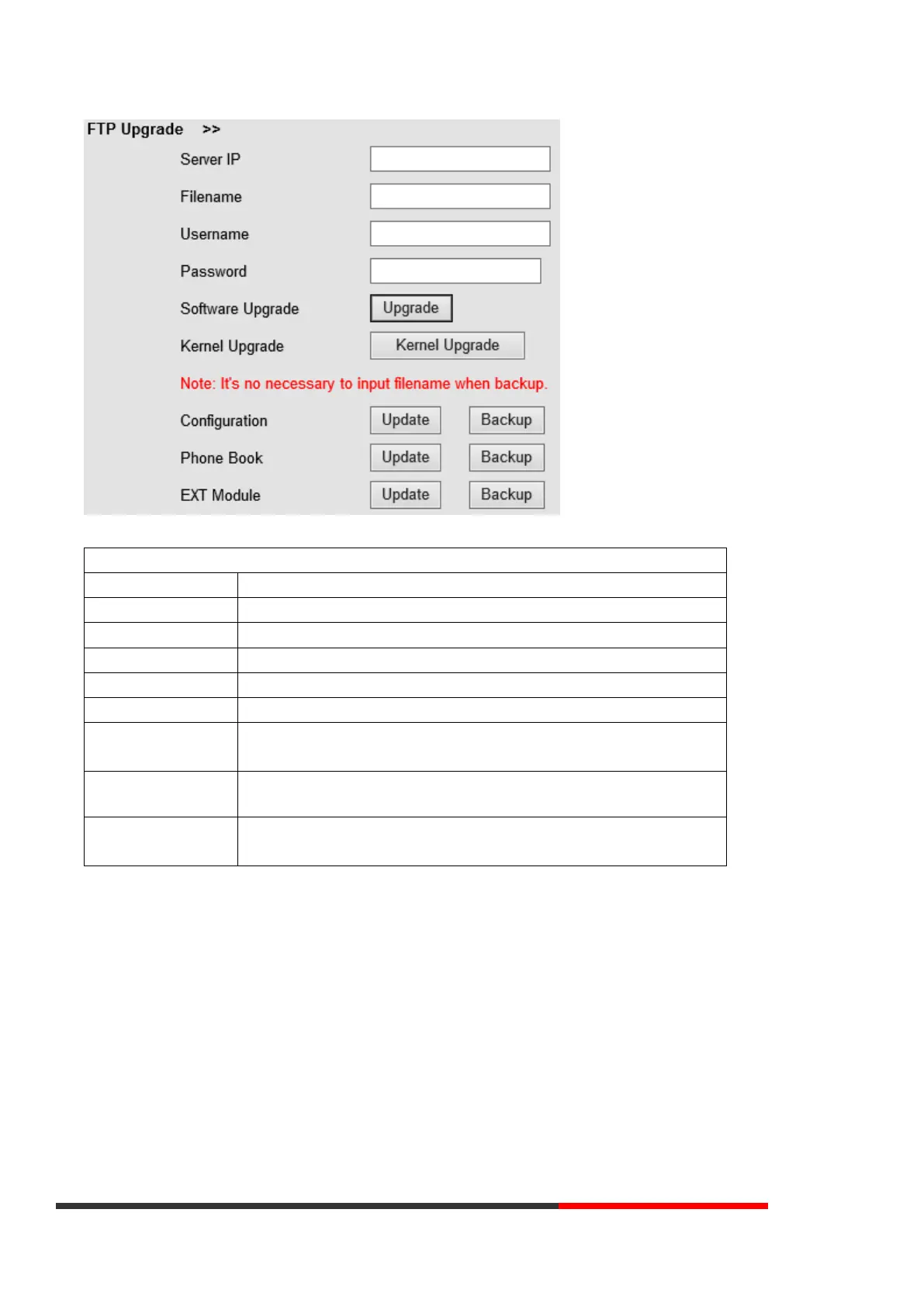NOTES: It is not necessary to input filename when doing backup Configuration, Phone Book, EXT Module.