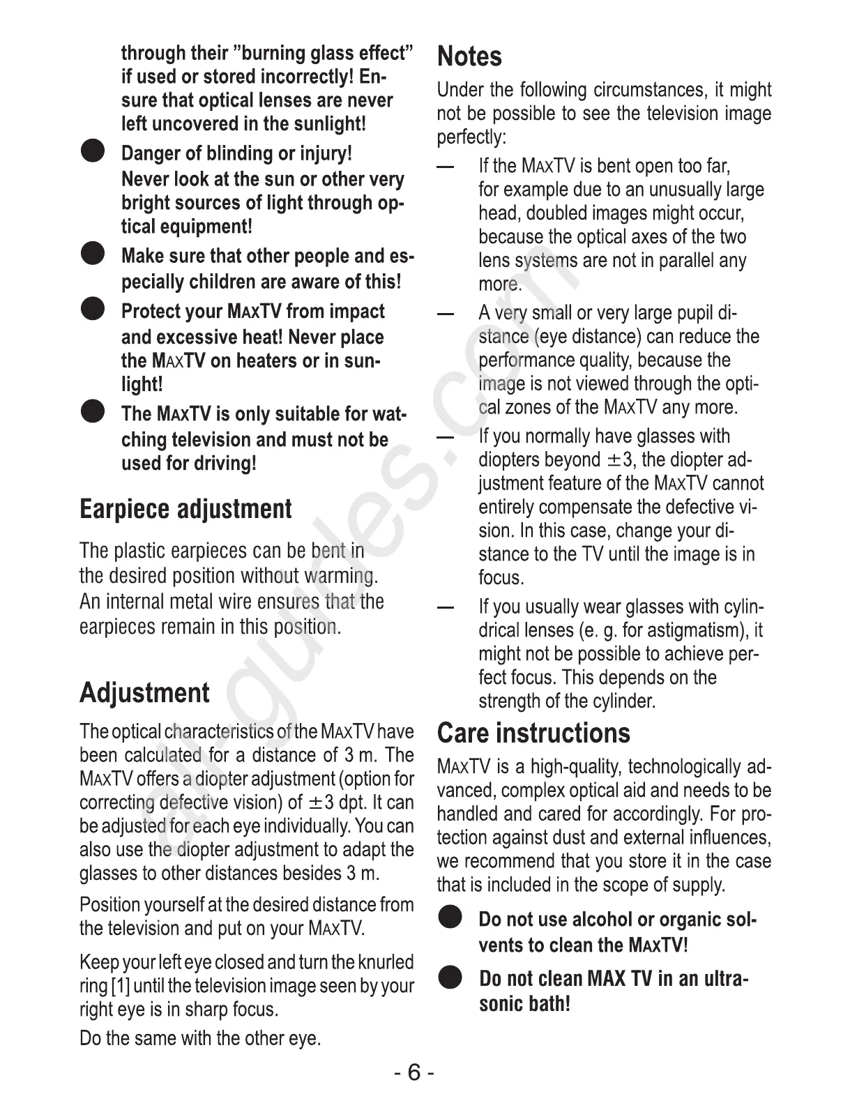 Eschenbach MaxTV - Adjustment; Earpiece Adjustment; Care Instructions