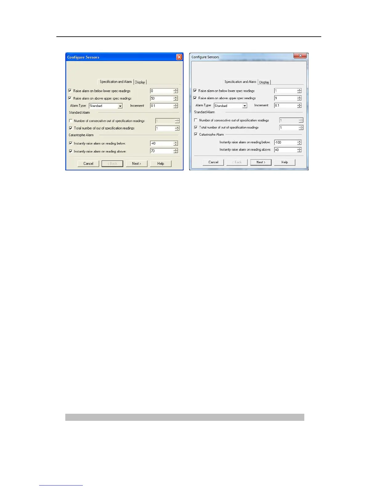 Raise alarm on below lower spec readings – tick this box if you want to activate the low alarm and select